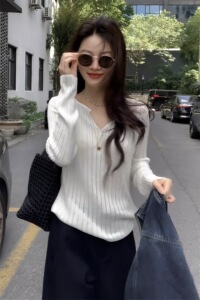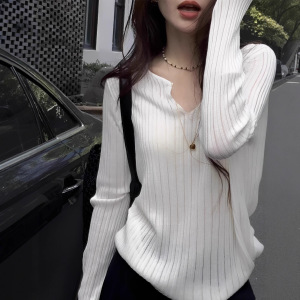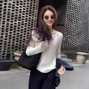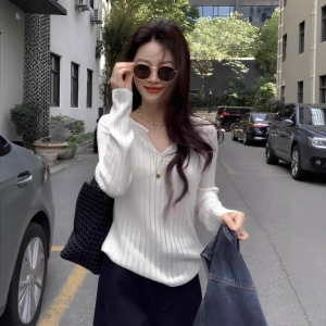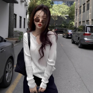 法式高级感独特漂亮白色坑条V领上衣女2025年秋季针织衫设计小众