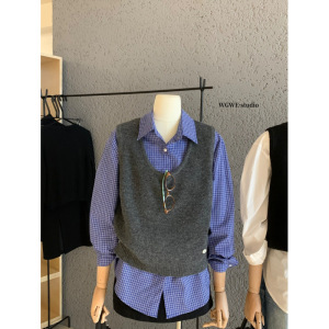 塞纳WGWE7134秋装新款女装时尚套装格子衬衫+针织马甲上衣两件套