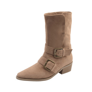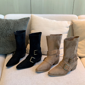 2262-5复古绒面大筒围瘦瘦靴女粗跟西部牛仔靴粗腿宽胖脚大码短靴