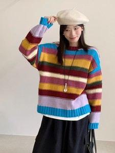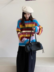 多巴胺彩色条纹复古撞色拉毛毛衣开衫女秋冬宽松慵懒风针织衫外套