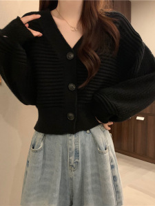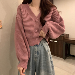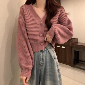 外贸短款针织开衫女秋装小个子正肩宽松慵懒毛衣外套韩系别致上衣