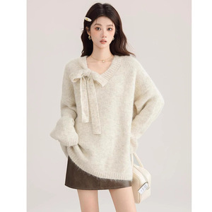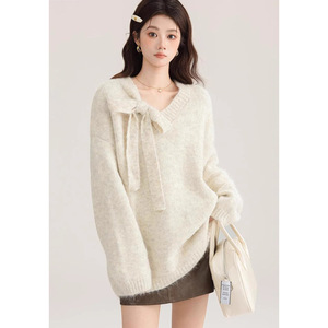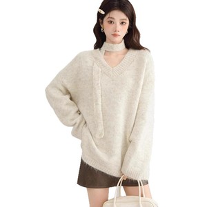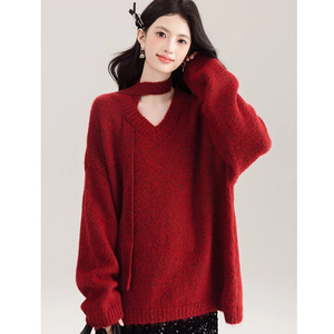 感挂脖红色领宽松大板针织衫毛衣女2025秋冬大码中长款上衣女套头