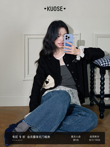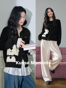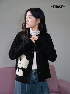 阔色刺绣小狗针织开衫外套上衣黑色女秋冬季新款小个子毛衣