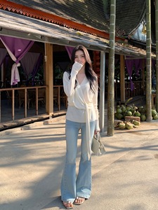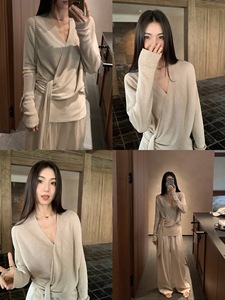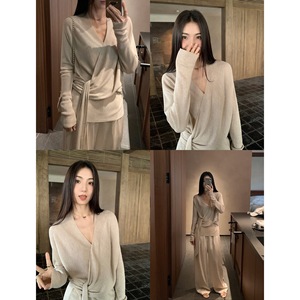MULVAN 清冷感姐姐 氛围感v领针织衫女小众设计气质收腰绑带上衣