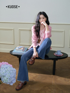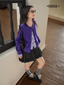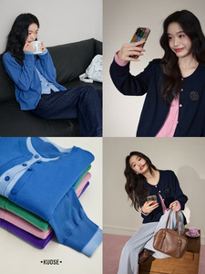阔色粉色撞色假两件针织衫开衫外套早秋穿搭新款女毛衣宽松上衣