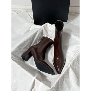 棕色短靴女高跟秋冬新款加绒法式小踝靴后拉链弹力尖头粗跟瘦瘦靴