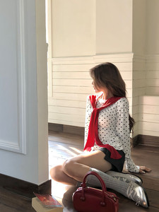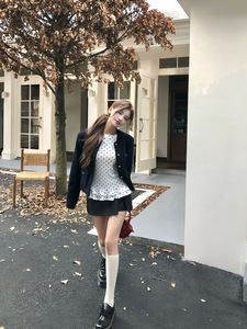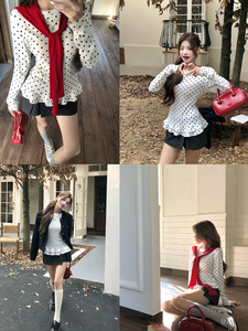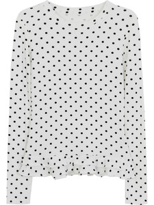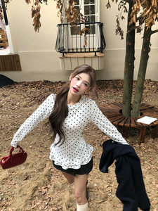 现货外贸韩系白色波点荷叶边长袖T恤辣妹修身显瘦短款内搭打底衫
