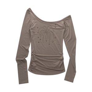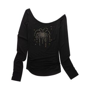 美式复古斜肩长袖t恤女早秋流行穿搭烫珠烟花打底衫修身辣妹上衣