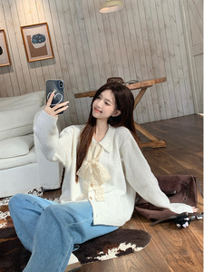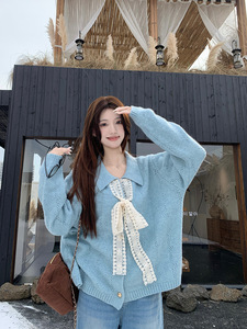 2025年秋设计感气质蕾丝系带蝴蝶结V领毛衣开衫女减龄减龄针织衫