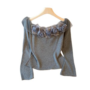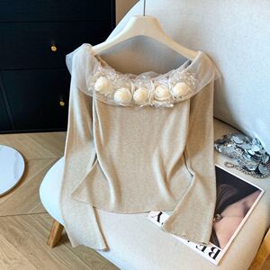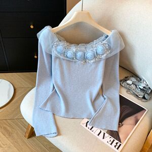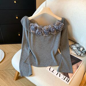 温柔风立体花朵一字肩长袖t恤女高级感别致浪漫修身显瘦针织上衣