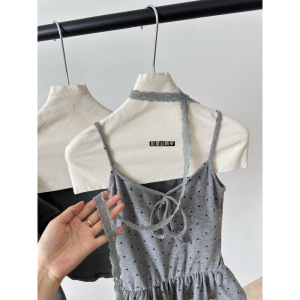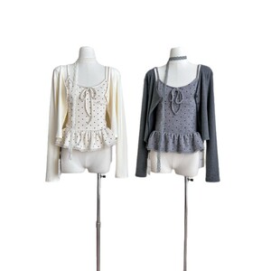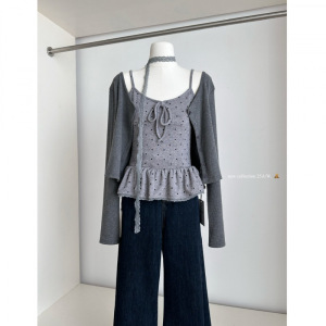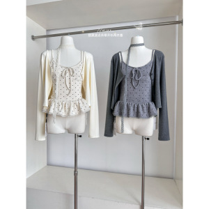2025新甜美风薄款长袖开衫外套女秋季内搭波点蕾丝边吊带两件套