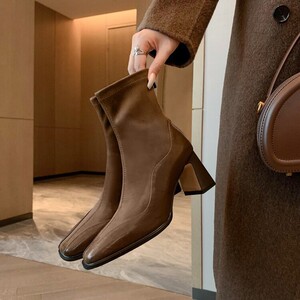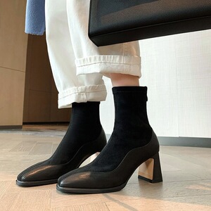 法式复古粗跟短靴女短筒秋冬拼接高跟方头弹力瘦瘦靴子