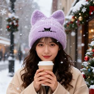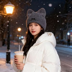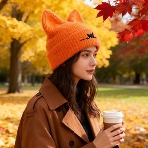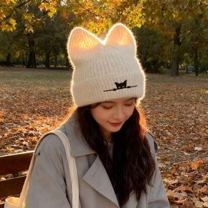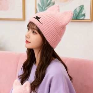 跨境新款猫咪耳朵针织帽刺绣毛线帽可爱秋冬保暖套头帽子外贸冷帽