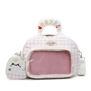 日系新款高颜值休闲背包大容量可爱吧唧格子透明层痛包学生双肩包