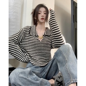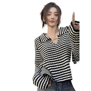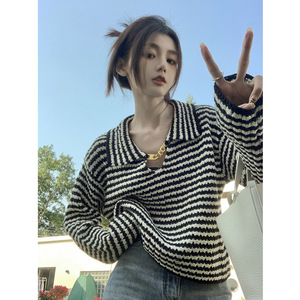 法式赫本风娃娃领毛衣女早季链条设计感宽松慵懒风条纹针织衫上衣