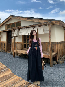 2025年秋季新艺术生背带裙抽绳宽松A字连衣裙+撞色纽扣针织打底衫
