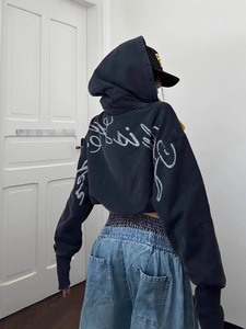 韩好甜WARDEN EDGE 黑色印花卫衣女秋修身显瘦复古开衫连帽短外套