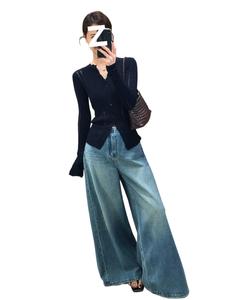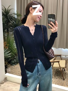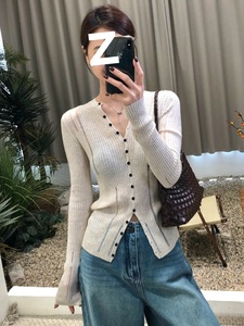 韩系穿搭设计感单排扣长袖针织衫女秋季镂空修身显瘦内搭打底上衣