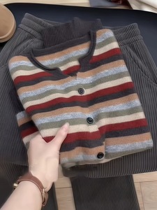 韩系圆领长袖彩色条纹针织开衫女秋季新款时尚洋气百搭毛衣外套潮