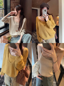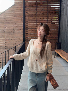 2025年秋季新款首尔假期镂空绞花罩衫毛针织衫+纯色吊带两件套