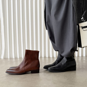 高货头层牛皮切尔西短靴女 方头质感牛皮通勤高跟鞋马丁靴女短靴