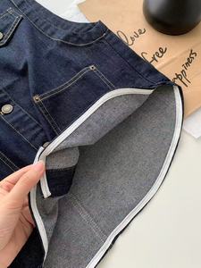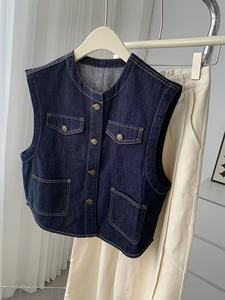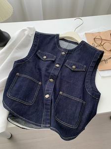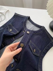 丹宁色软牛仔圆领马甲女洋气复古小金扣明线外套秋季叠穿无袖开衫