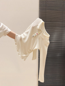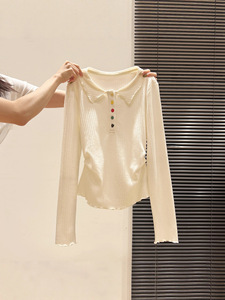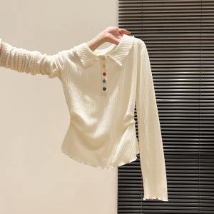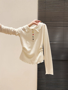 自带氛围感!polo领彩色纽扣长袖t恤韩系早秋穿搭新款褶皱打底衫