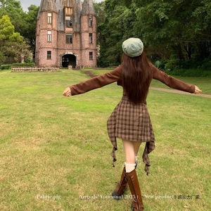川西回忆 复古咖色格纹吊带连衣裙女秋季短款裙子
