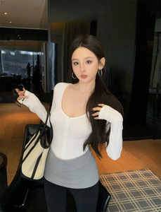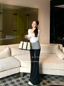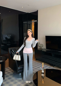 小个子绝美小套装韩女曲线V领修身打底衫长袖上衣撞色微喇叭长裤