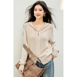 跨境女装针织衫2025秋冬新款时尚设计感麻花条拉链开衫连帽毛衣