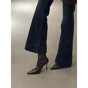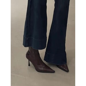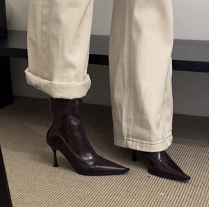 东大门靴子女瘦瘦靴细跟高跟短靴尖头气质软皮后拉链百搭短筒靴女