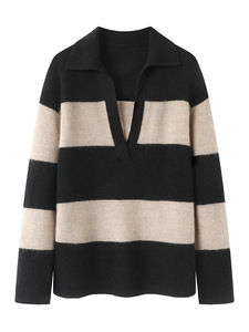 MO家2025秋季新品大V领宽条纹套头宽松羊毛长袖针织衫毛衣上衣