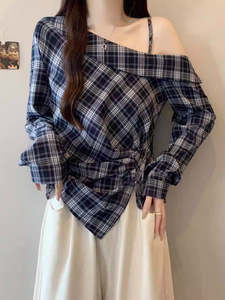感格子斜肩长袖衬衫早秋2025新款大码女装胖mm不规则收腰上衣