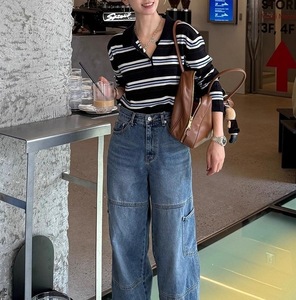 韩系条纹撞色polo领针织衫女早秋氛围感穿搭短款修身毛衣内搭上衣