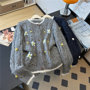 自留款推荐~减龄撞色手工钩花毛衣女2025秋冬新款慵懒风针织开衫