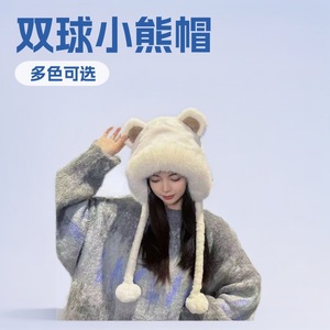 秋冬成人系带可爱加厚双球小熊帽子毛绒帽子帽百搭骑车护耳毛球帽