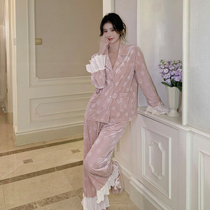 法式睡衣套装新品丝绒衬衫睡衣女长袖喇叭袖薄绒宽松可外穿家居服