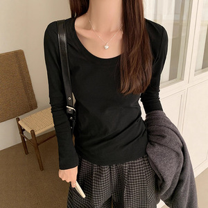 U领纯棉正肩长袖纯欲打底小衫t恤女基础款修身秋冬大领口内搭上衣