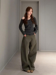 2025韩系感单排扣斜肩长袖针织衫早秋季单穿超好看修身短款打底衫