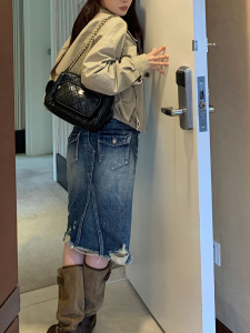 SUNONEON 磨破水洗中长牛仔半身裙女早秋季a字小个子包臀裙子