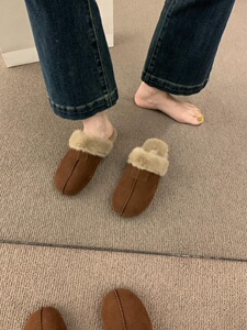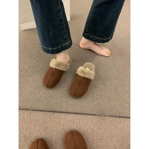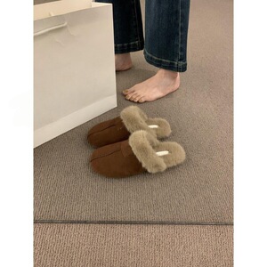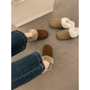 复古森系磨砂皮平底包头半拖鞋女外穿2025秋冬新款棉鞋加绒勃肯鞋