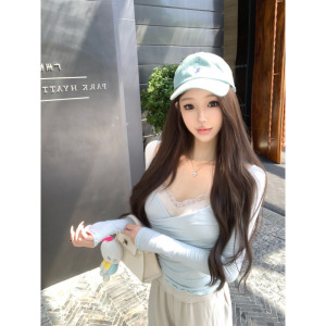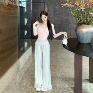 昕可达【纯欲担当】真两件蕾丝褶皱背心直筒宽松针织长裤套装