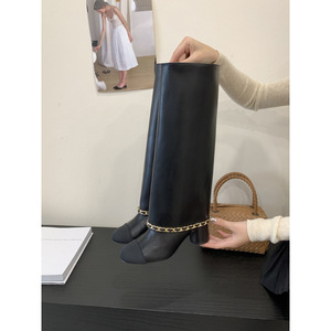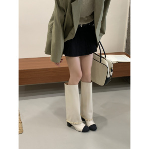 小香风圆头拼色骑士靴2025年秋季新款气质粗跟高筒裤管靴女