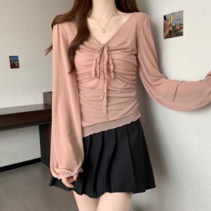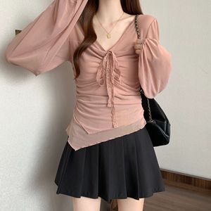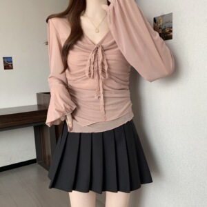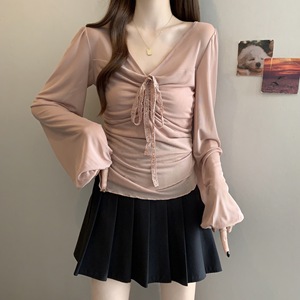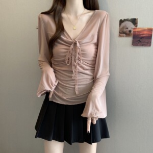 大码V领绑带褶皱小衫T恤女秋季新款温柔风纯欲气质收腰显瘦上衣