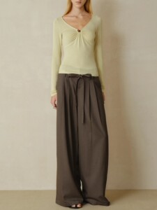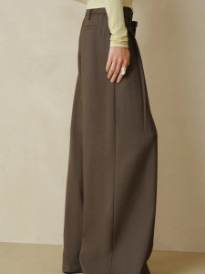 天丝羊毛无腰头双裤耳腰带双褶阔腿斜纹西裤