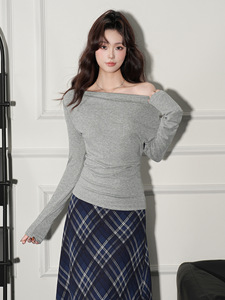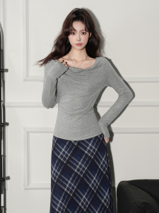季优 灰色一字领露肩露背长袖T恤女早秋穿搭内搭镂空打底修身上衣