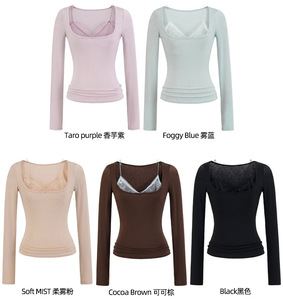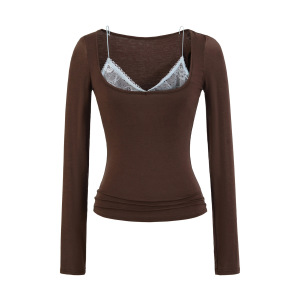 蕾丝边拼接洋气打底衫辣妹修身大U领韩系上衣纯欲风修身长袖T恤
