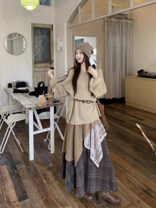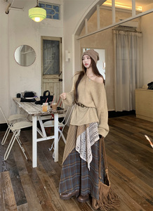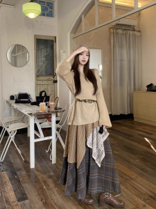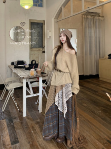 复古套装设计感不规则长袖露肩针织衫上衣女春季高腰半身裙两件套