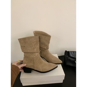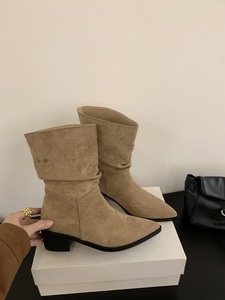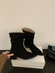 复古绒面尖头堆堆靴西部牛仔靴女2025新款瘦瘦靴不过膝粗跟骑士靴