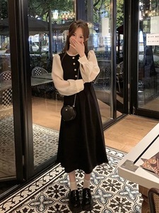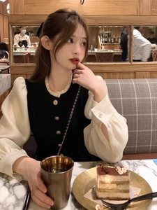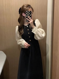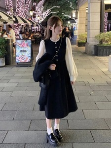 立领泡泡袖连衣裙2025秋冬新款黑白拼接假两件小香风显瘦中长裙子